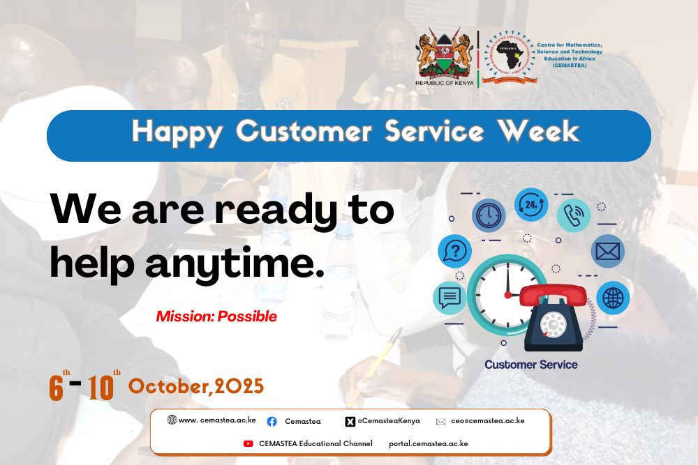As CEMASTEA, we take a moment to appreciate and celebrate our valued customers. We remain committed to offering quality services in a timely, efficient and effective manner. Thank you for being part of our mission to continuously develop capacities in STEM education for sustainable development through Training, Research, Innovation and partnerships with related ecosystems.